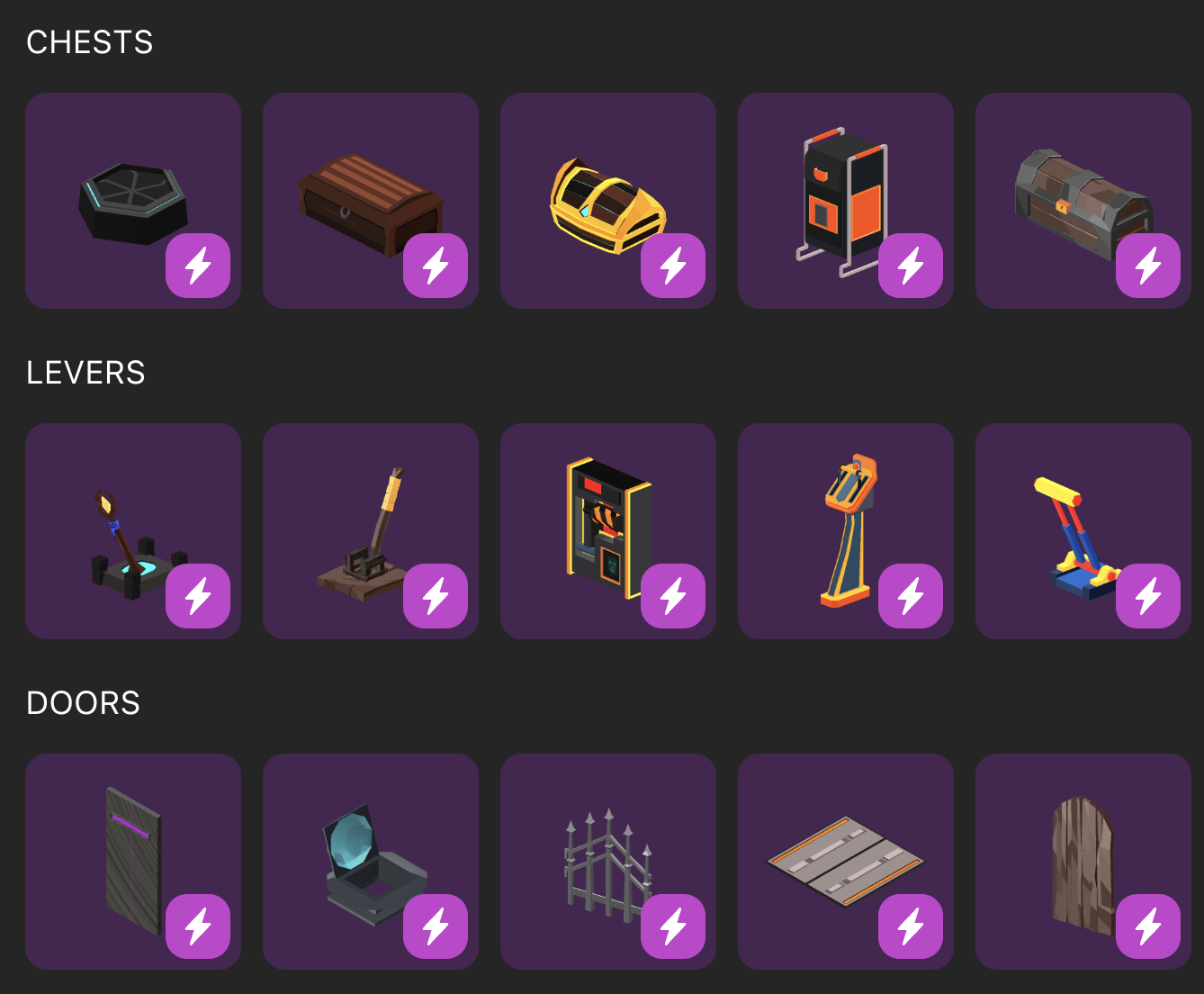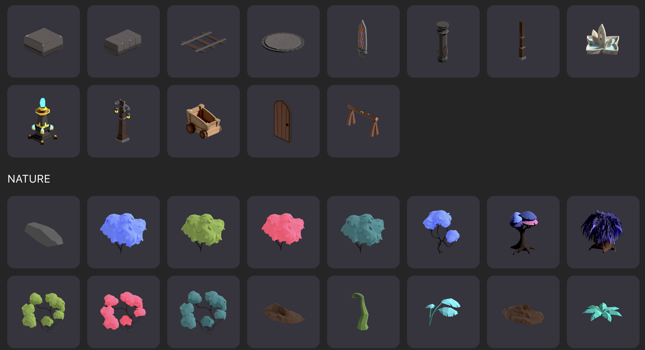 • Chose from the wide catalog of default assets in the Scene Editor. These are ready to go and optimized for using in Decentraland