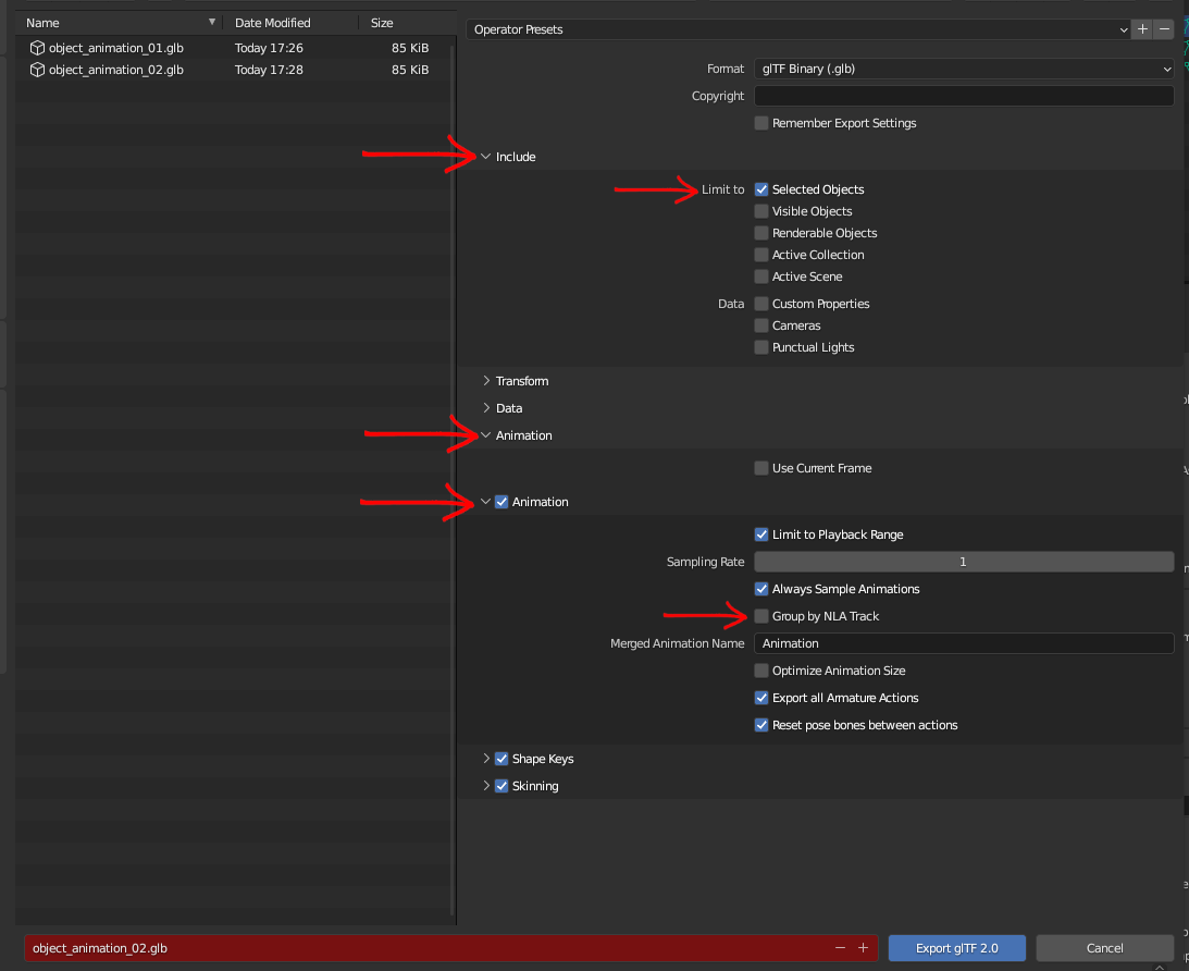 • When exporting the glTF model, confirm that you’re exporting all the objects and animations. Some exporters will only export the currently selected by default.