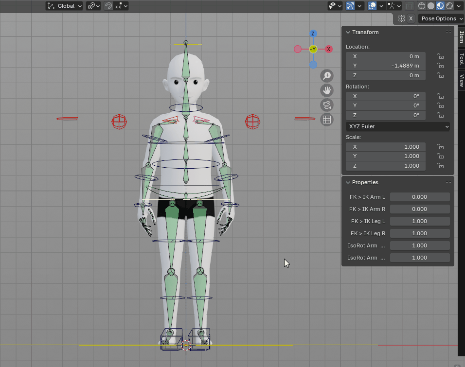 Even though arms are usually set as FK and legs as IK, there are certain situations that will require a different setup. If the hand has to maintain a certain position, like during push ups or while climbing, the IK will be the best choice. As for the legs, while in the air, swimming or rolling, FK works best. For more flexibility and freedom in animation, this rig has an FK/IK blend in the UpperBody control, being 0 completely FK and 1 completely IK. Any other value in-between will be a blend of the two.
