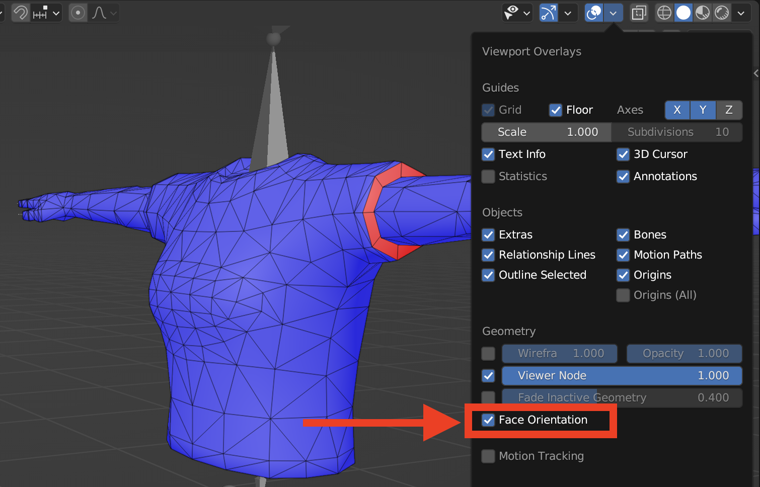 The second way to check if the normals are right is by toggling “Face orientation” on the viewport overlay options. It will turn your model blue, but don’t worry. The blue faces are the correct ones and the red ones are the ones that needs to be corrected, you can find this option here: