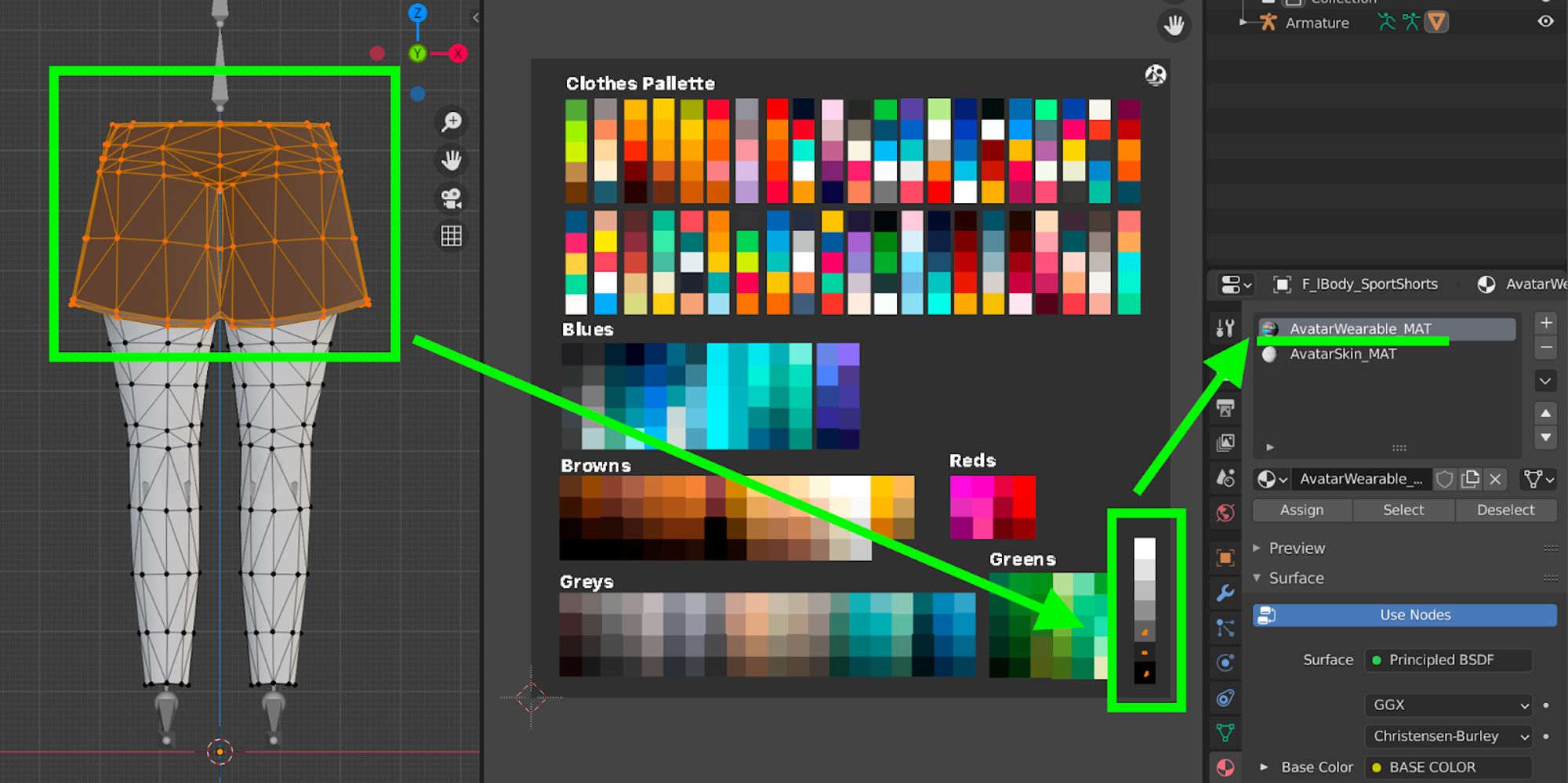 There are three basic materials for avatar models. One is the material used for the wearable itself, another one is used for the skin and another one for the eyebrows, eyes and mouth.