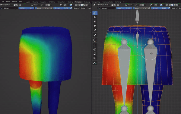 With this loopcuts the vertex influence look a lot more smooth and give you better results when you’re animating a skirt/dress.