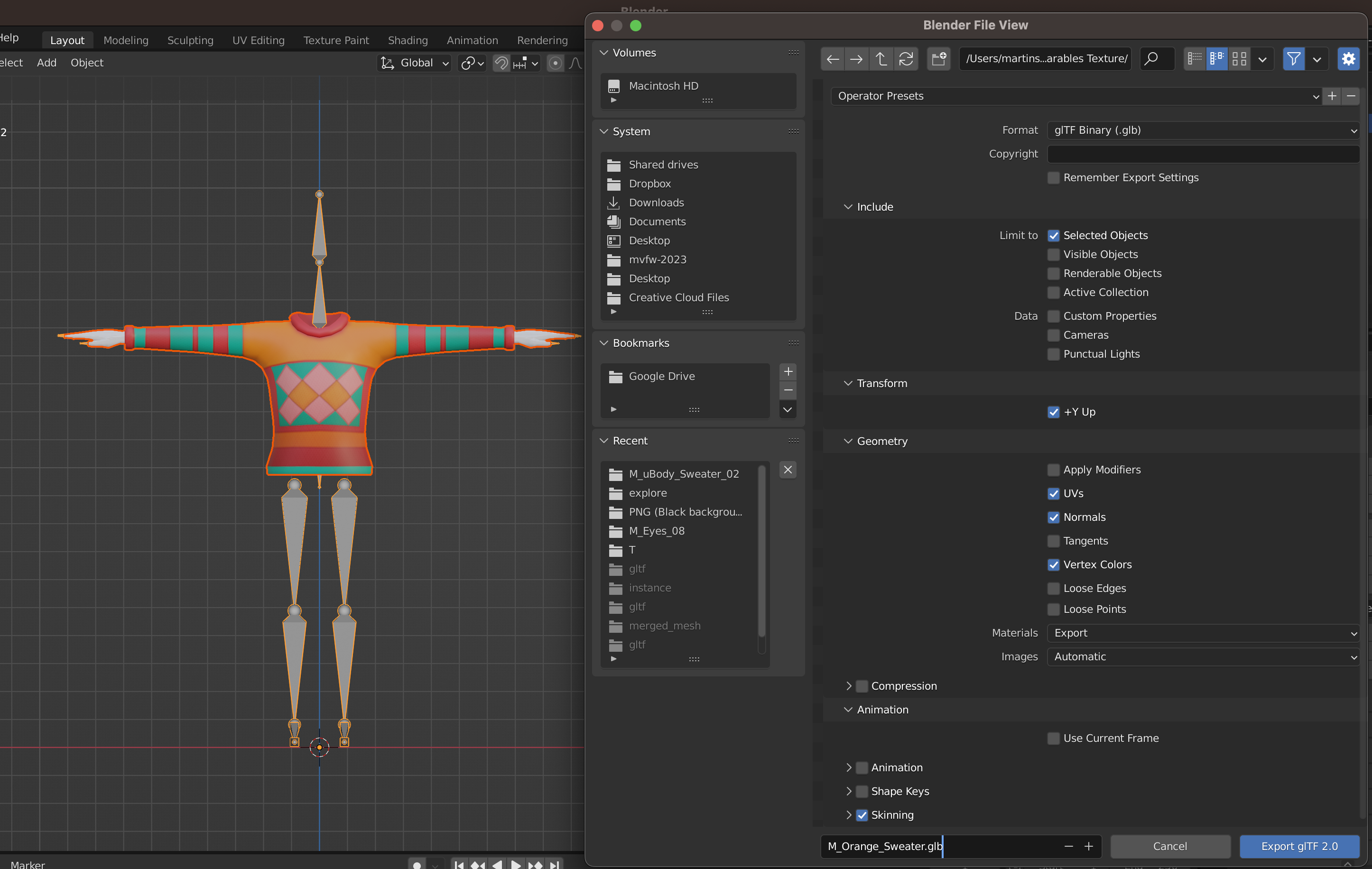 Next, export the wearable in glTF2.0 format. Make sure you only export the wearable with its skinning properties, and without any other unnecessary features like animation or shape keys.