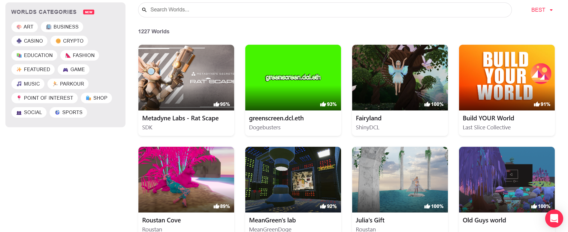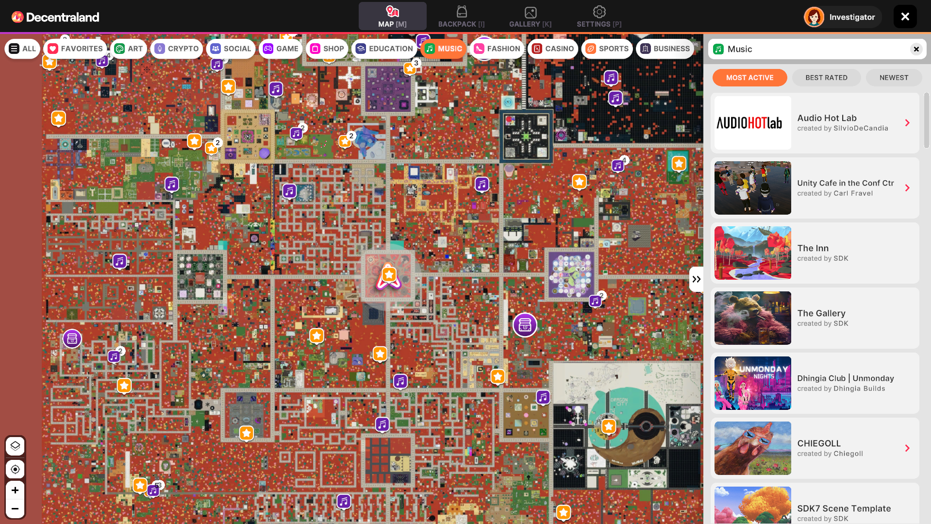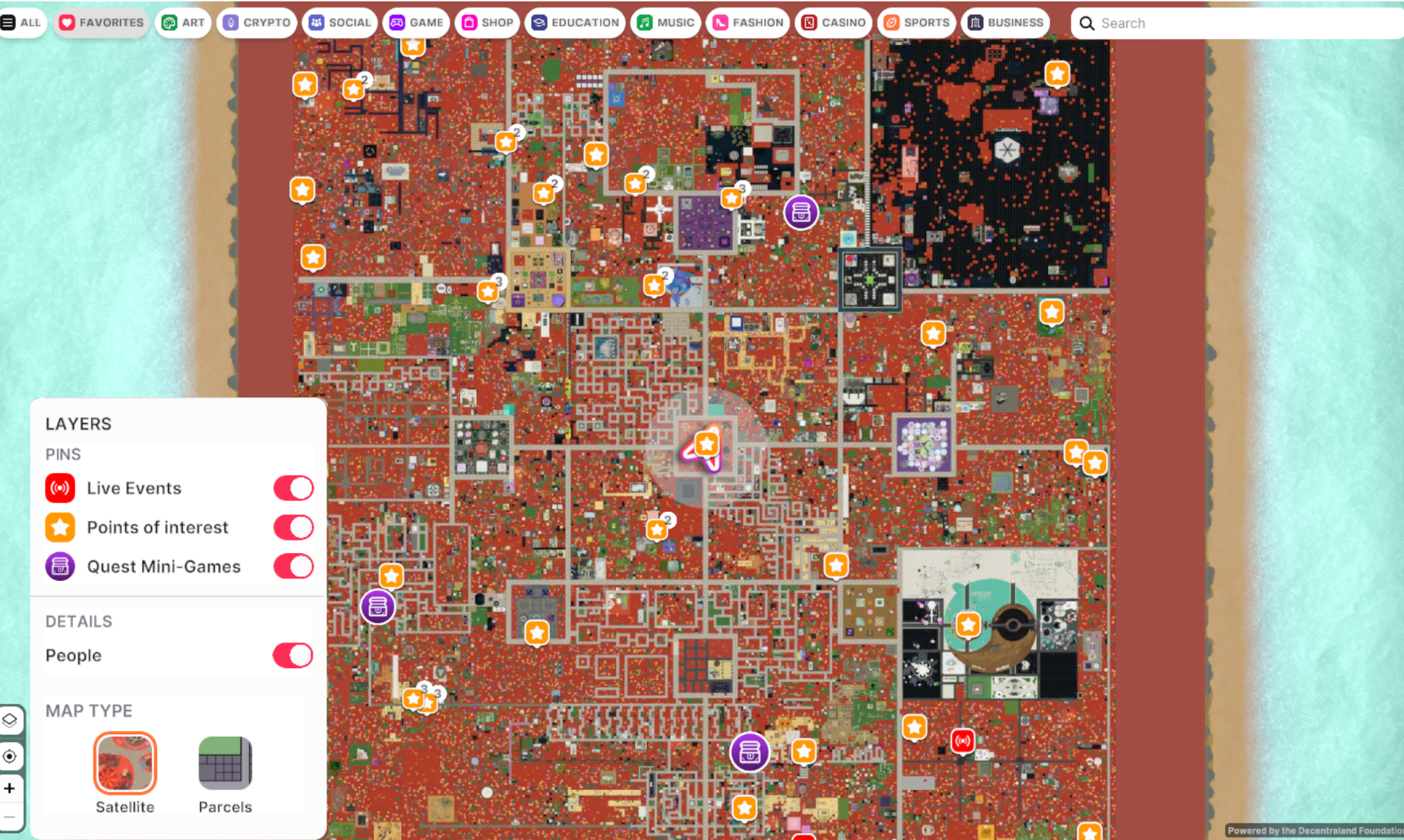 Discoverer interesting locations in Decentraland based on categories. When you open the map, you’ll see a variety of Category bubbles along the top of the screen, including topics like Art, Music, Games, etc.